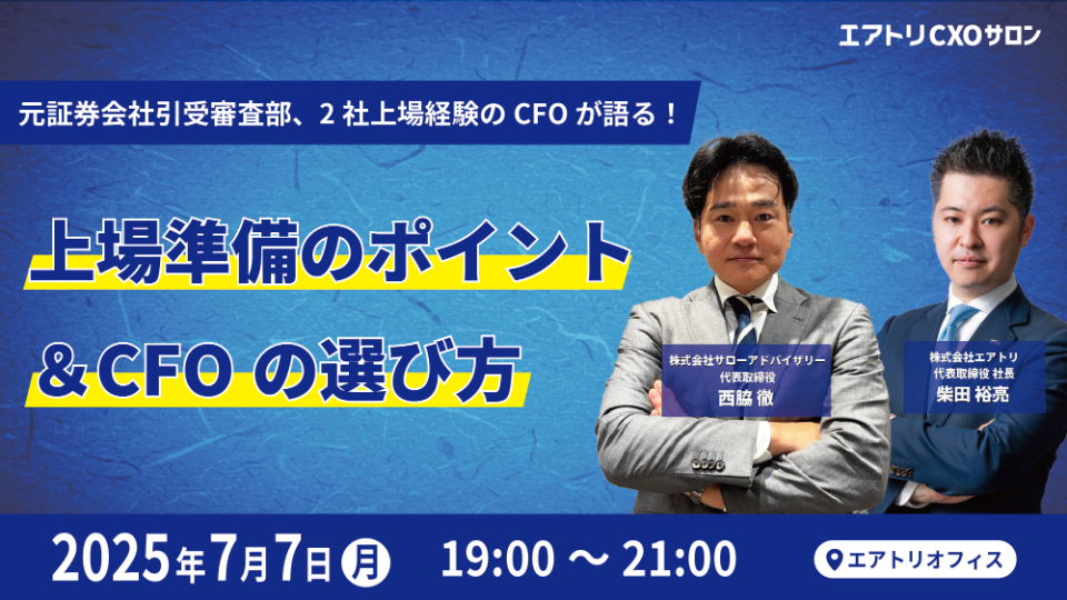 元証券会社引受審査部、2社上場経験のCFOが語る上場準備のポイント&CFOの選び方をお話しいただきます。