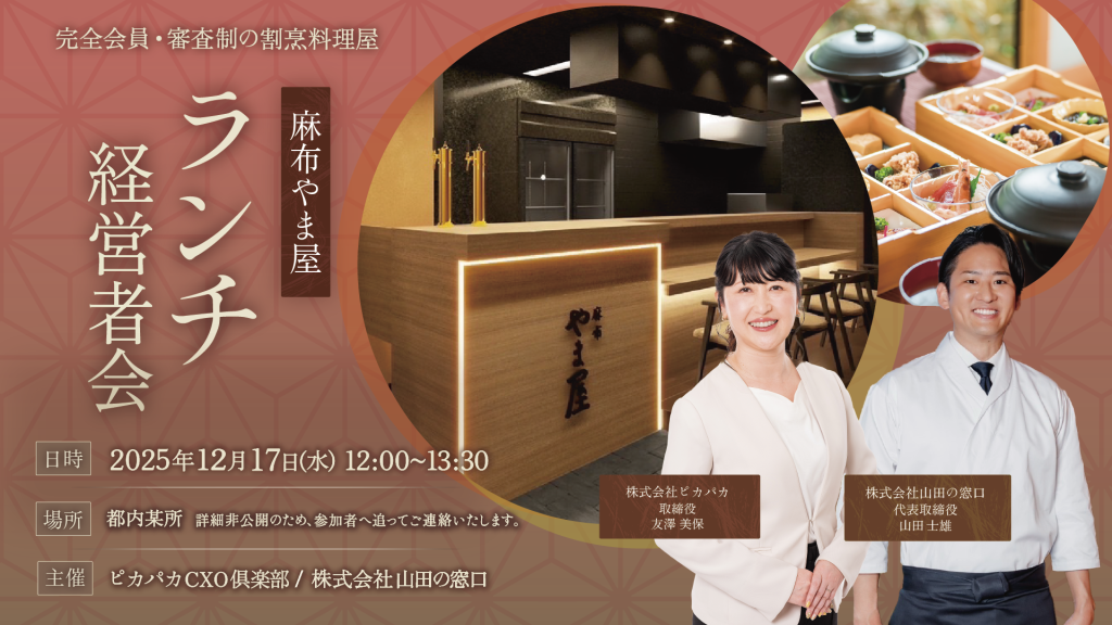 山田家で営み30年、会員制割烹「麻布やま屋」にて、着座スタイルでのランチ経営者交流会を少人数に限定して開催いたします。