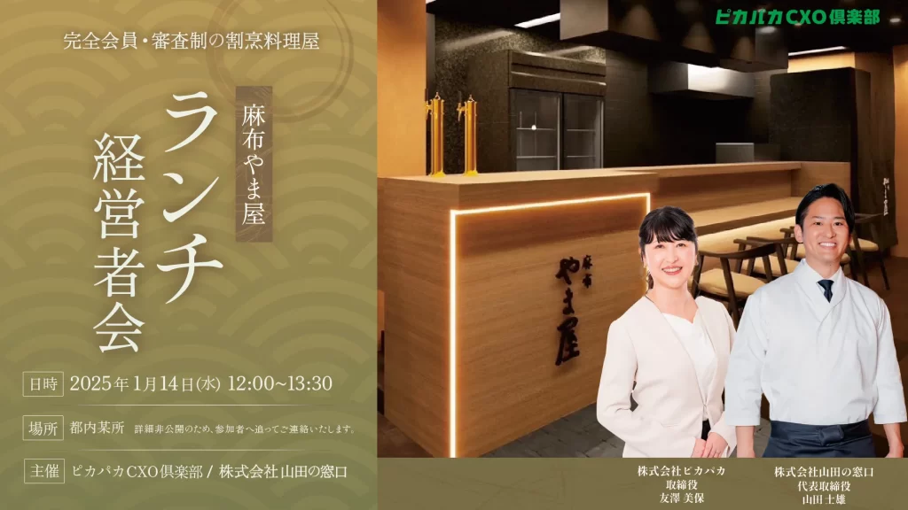 山田家で営み30年、会員制割烹「麻布やま屋」にて、着座スタイルでのランチ経営者交流会を少人数に限定して開催いたします。