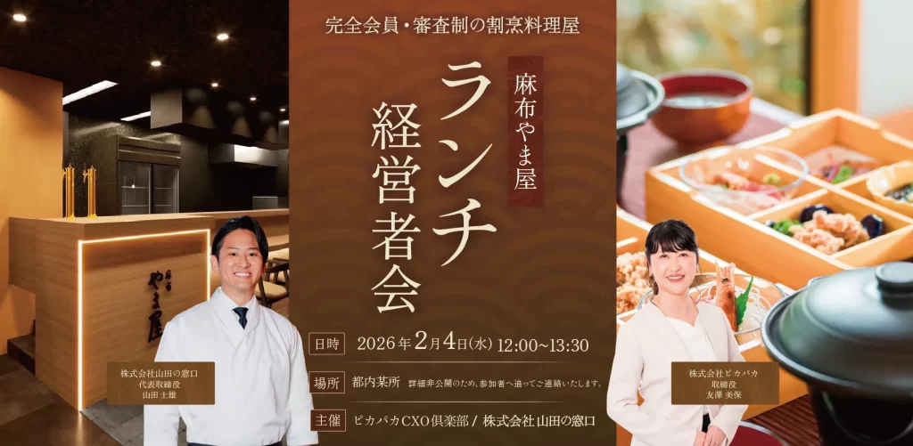 山田家で営み30年、会員制割烹「麻布やま屋」にて、着座スタイルでのランチ経営者交流会を少人数に限定して開催いたします。